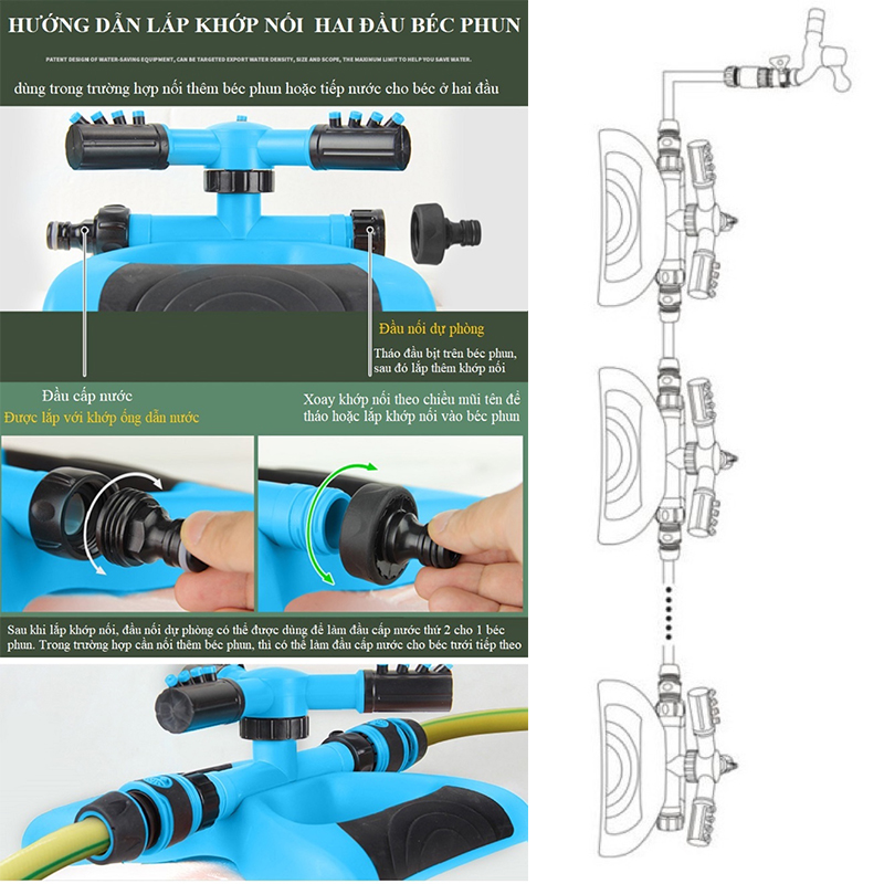 Béc tưới cây phun mưa tự động xoay 360° + bộ cút nối nhanh