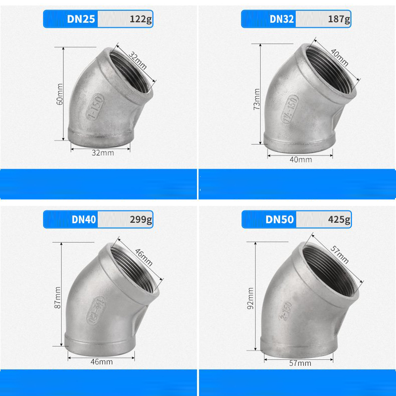 Co lơi ren inox, chếch ren inox, co ren inox 201/304/316 45 độ được sử dụng trong: năng lượng điện, dầu khí, hóa chất, đóng tàu, thiết bị nhiệt, làm giấy, hệ thống cấp thoát nước, đường ống pccc, thực phẩm, …