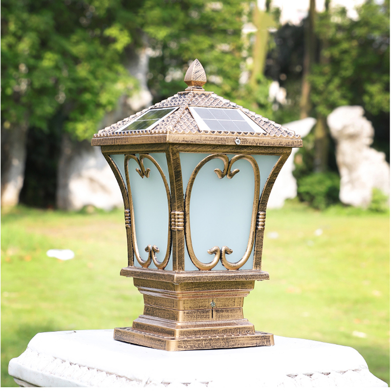 Đèn gắn trụ cổng năng lượng mặt trời mái chóp hoa văn màu đồng