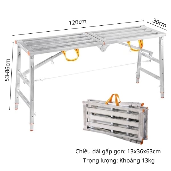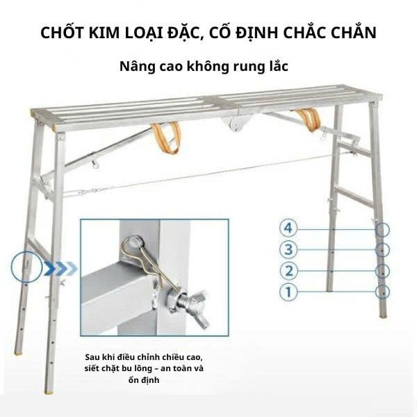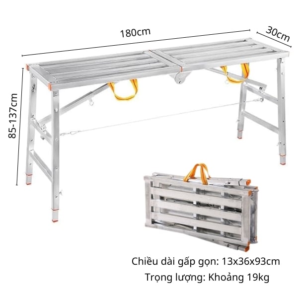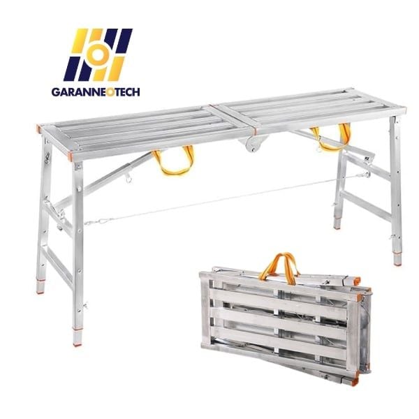 Giàn giáo gấp gọn di động được chế tạo từ thép carbon chắc chắn với khả năng gấp gọn nhanh chóng. với tải trọng tối đa 150kg và chiều dài linh hoạt từ 1.2m đến 2m, sản phẩm không chỉ bền bỉ mà còn dễ dàng điều chỉnh chiều cao, phù hợp cho xây dựng, trang trí nội thất, và nhiều công việc ngoài trời.
