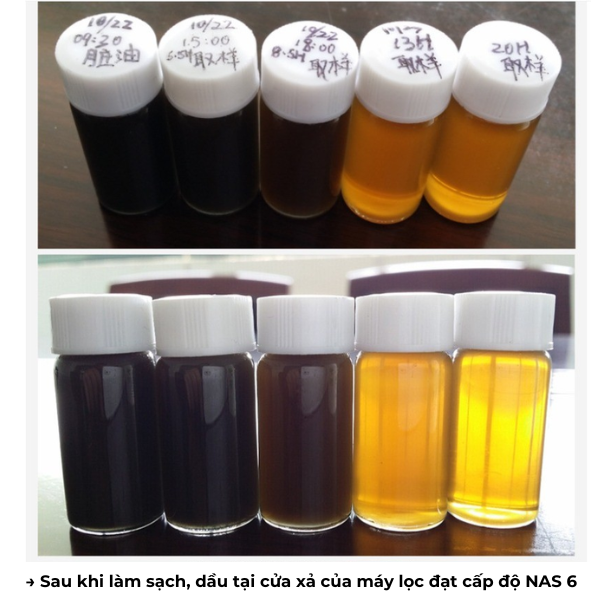 Hình ảnh so sánh mẫu dầu trước lọc và các mẫu dầu sau khi lọc theo từng mốc thời gian