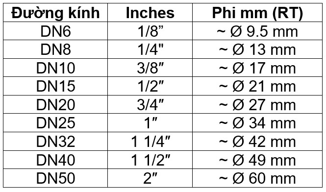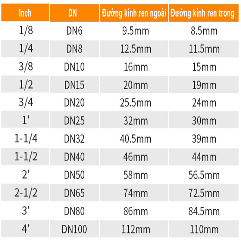 Bảng quy đổi kích thước ren