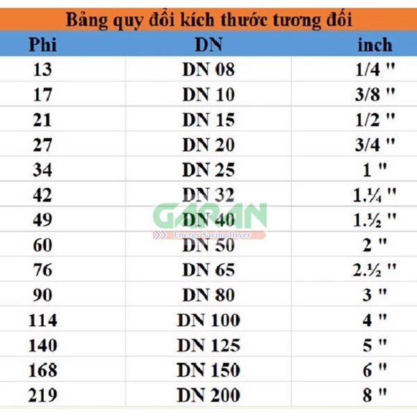 Bảng quy đổi kích thước tương đối của đầu phun nước nghệ thuật