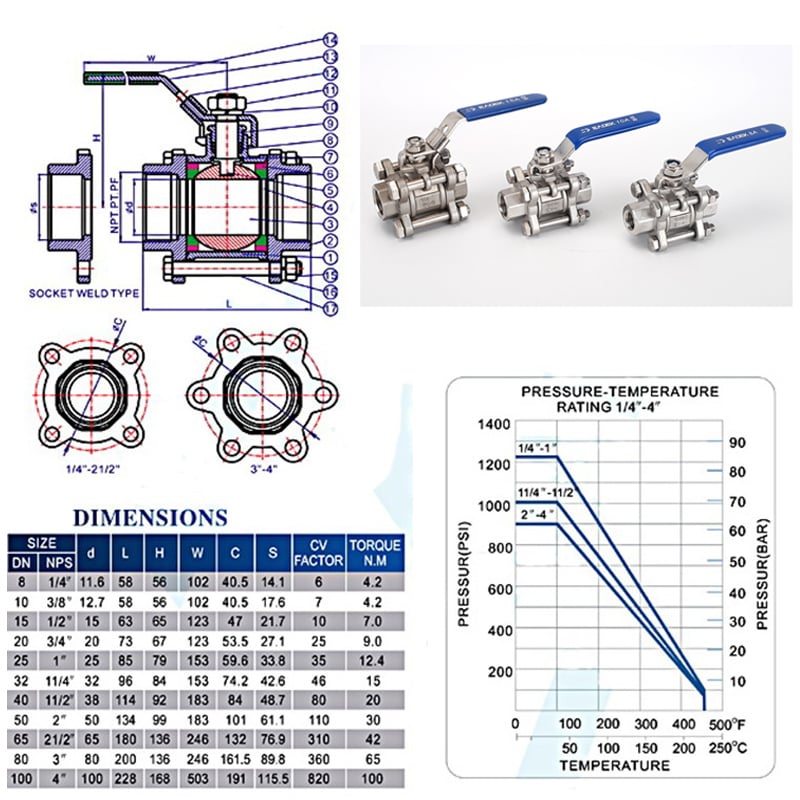 Cấu tạo & kích thước của van bi tay gạt inox 3 mảnh