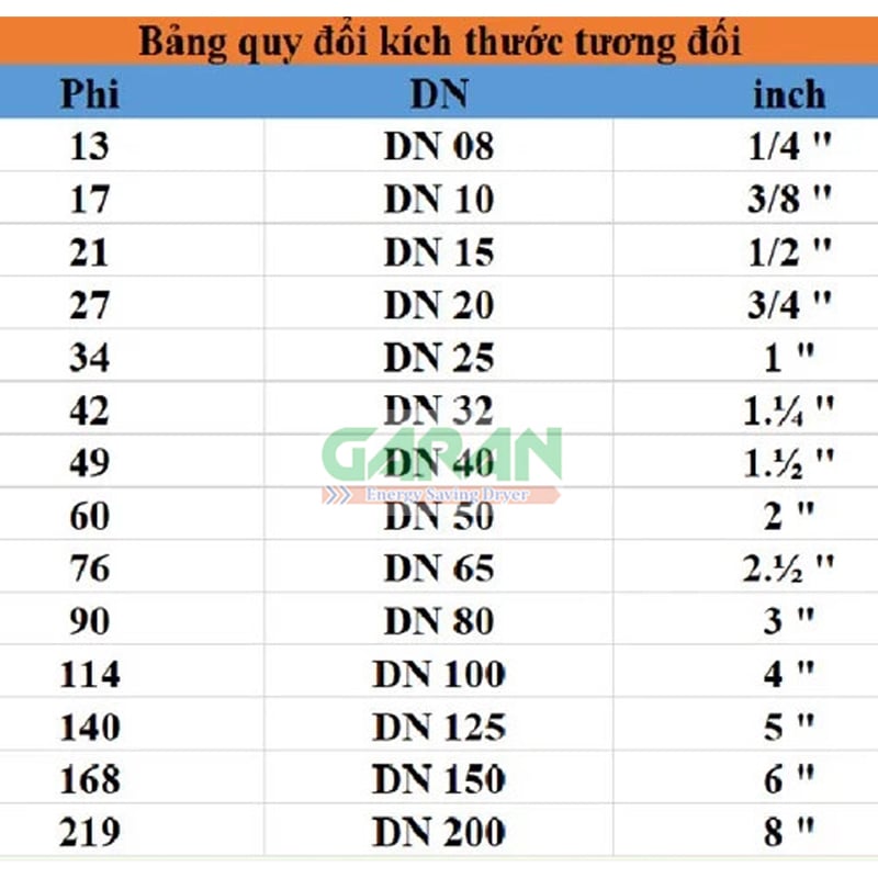 Bảng quy đổi kích thước tương đối của đầu phun